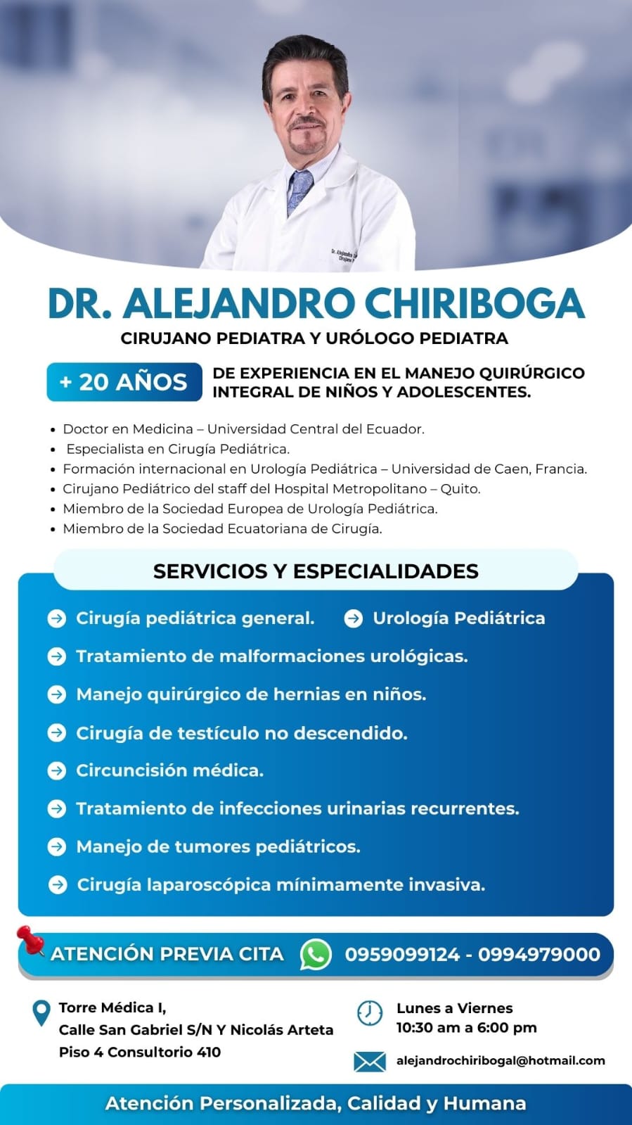 Dr. Alejandro Chiriboga León Cirujano Pediatra y Urólogo Pediatra con más de 20 años de experiencia en el diagnóstico y tratamiento quirúrgico de patologías infantiles. Su formación en la Universidad Central del Ecuador y en la Universidad de Caen, Francia, junto con su membresía en la Sociedad Europea de Urología Infantil y la Sociedad Ecuatoriana de Cirugía Pediátrica, respaldan una práctica médica basada en criterios científicos actualizados y estándares internacionales.